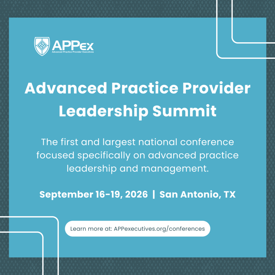 APPex’s annual conference held in September--the Advanced Practice Provider (APRN & PA) Leadership Summit--is the first and largest conference specifically geared towards advanced practice leadership and administrative topics.